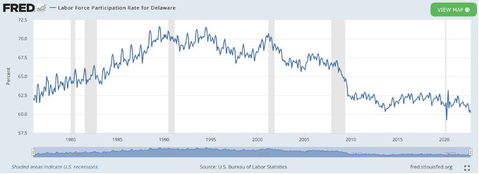 Cab Calloway's "Minnie the Moocher." The great Cab Calloway spent the last years of his life in Delaware. This hit song reflects the growth in government transfer payments in Delaware, which have grown by almost 400% from 2002 to 2020 - 20% faster than the national average. In addition, as shown in the graph below, Delaware's workforce participation is lower today than at any other time since the federal government began tracking the statistic (with one COVID-19 related exception). Too many Delawareans are forced to mooch off the State rather than participate in the workforce and economy.